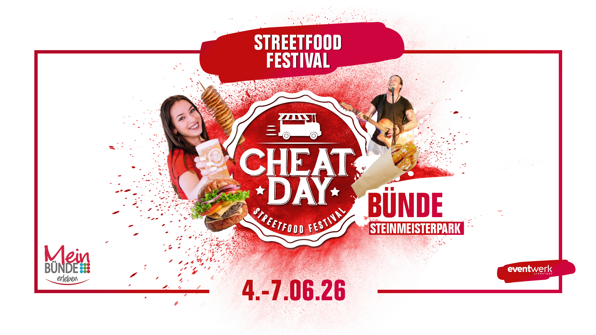 Vom 04. Juni bis 07. Juni 2026 verwandelt sich der Steinmeisterpark in Bünde in ein wahres Schlemmerparadies. Beim CHEATDAY Streetfood-Festival präsentieren rund ein Duzend Foodtrucks internationale Köstlichkeiten – von saftigen Burgern, Pastrami Kartoffelwaffeln und würzigen Bowls bis hin zu süßen Highlights wie Churros, Crêpes und Waffeln. Alles wird frisch zubereitet und mit viel Liebe serviert, damit sich Besucherinnen und Besucher durch die kulinarische Vielfalt probieren können.